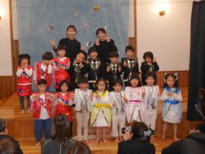 大好きな保護者の方に見てもらい、うれしい反面少し緊張ぎみのたんぽぽ組さんでしたが、舞台に上がると「はい!」とお返事をしてくれたり、リンリンリンと鈴をならしたり練習以上にできました🎵